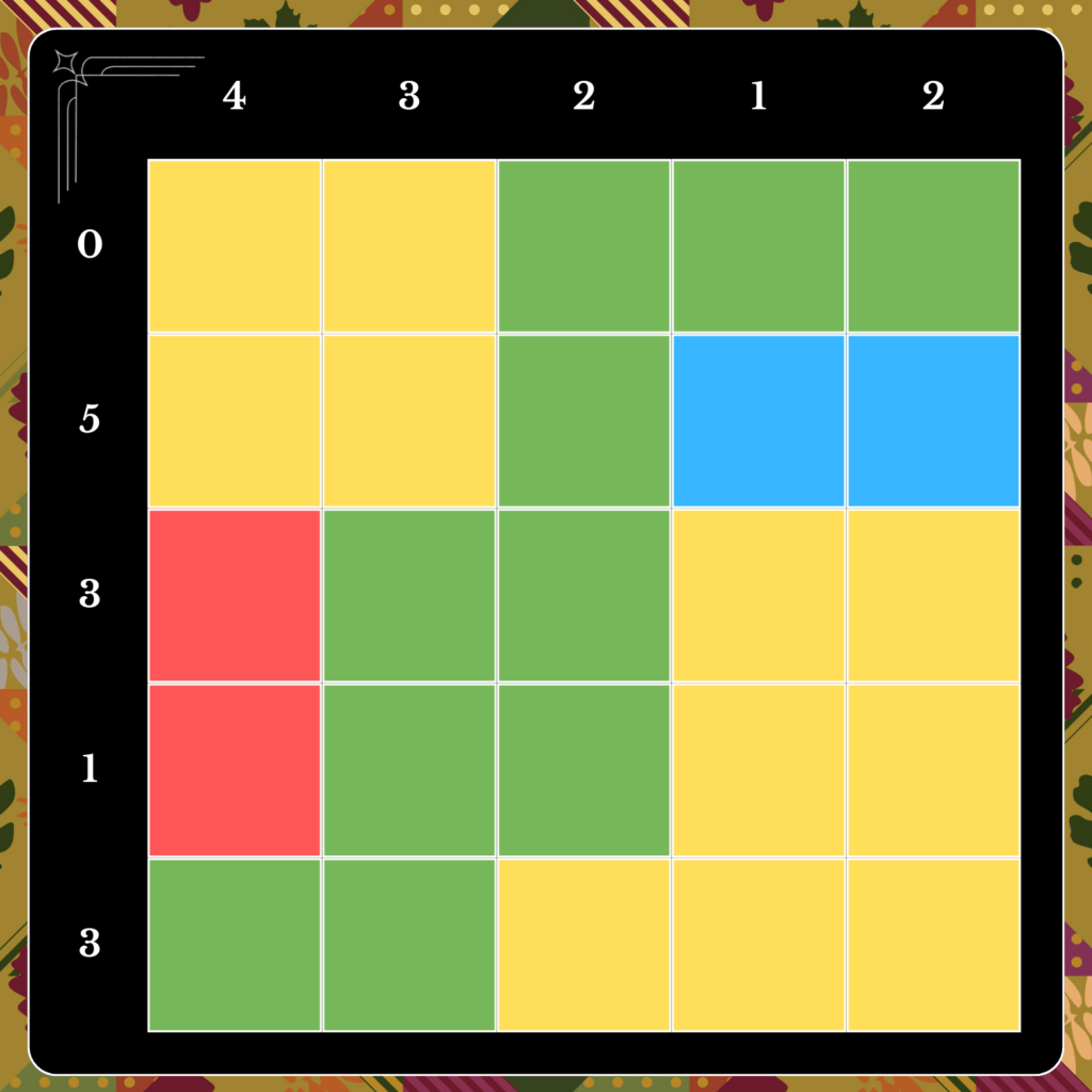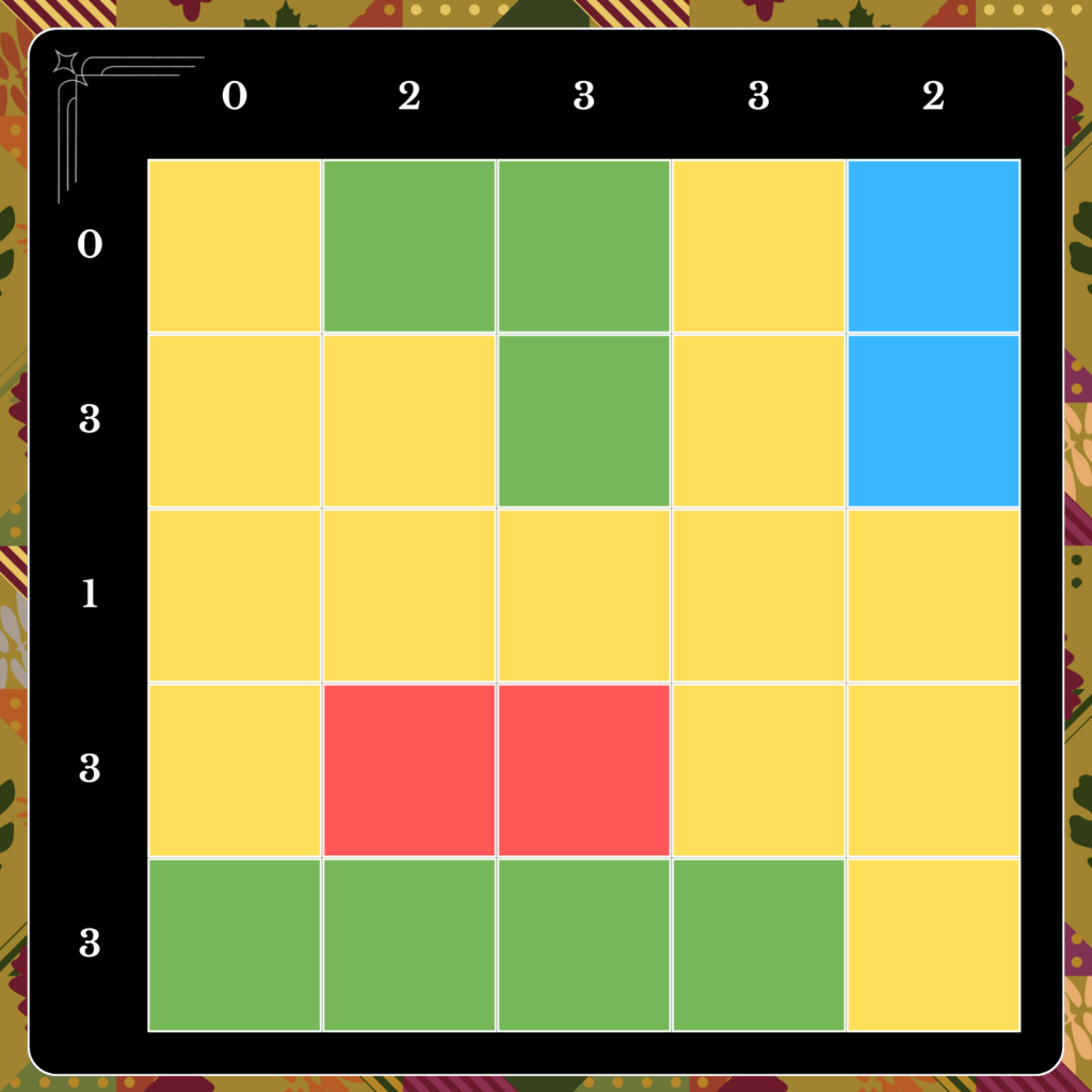 The next entry is based on Stitches. Marie Touveau, an expert in various art styles, has recently taken up quilting. Her creations are special in that they involve a rather complex stitching pattern. Your goal is to stitch one of Marie’s quilts, represented as a grid, according to the following rules: