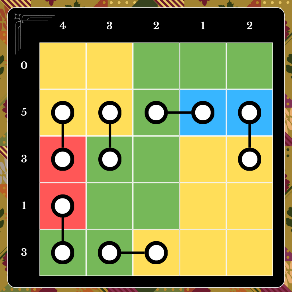 The pictures below depict a sample puzzle on a 5×5 grid, along with its solution. Each patch is colored to help distinguish it from its neighbors.